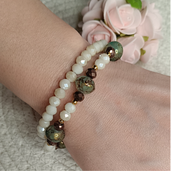 Ontdek de perfecte balans tussen klassiek enn stoer. De Vitage Pearl & Bronze armbanden vallen op door de bijzondere groene kralen met een gemeleerde goudprint. De fonkelende facetkralen vangen het licht op bij elke beweging.
