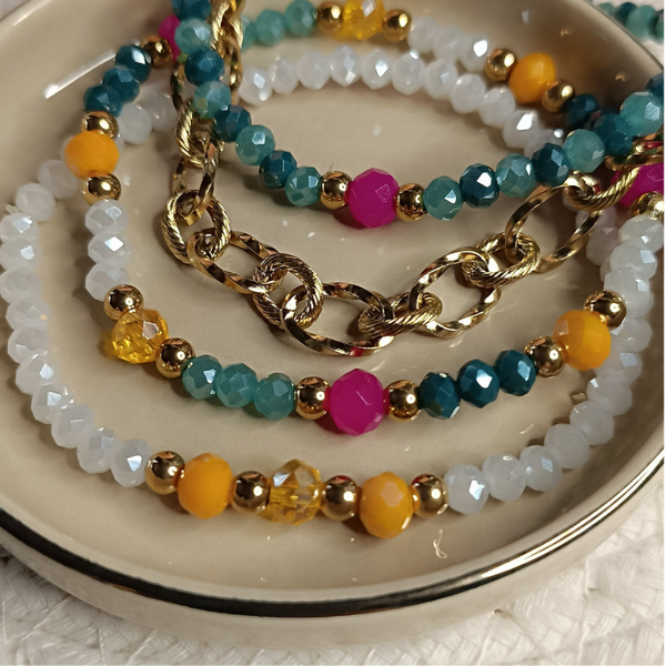 Breng de zomer naar je pols met de 'Tropical Treasure' set. Deze vrolijke combinatie van goudkleurige schakels, heldere kralen en tropische kleuren zoals diepblauw, warm geel en felroze geeft elke outfit direct een vakantiegevoel.